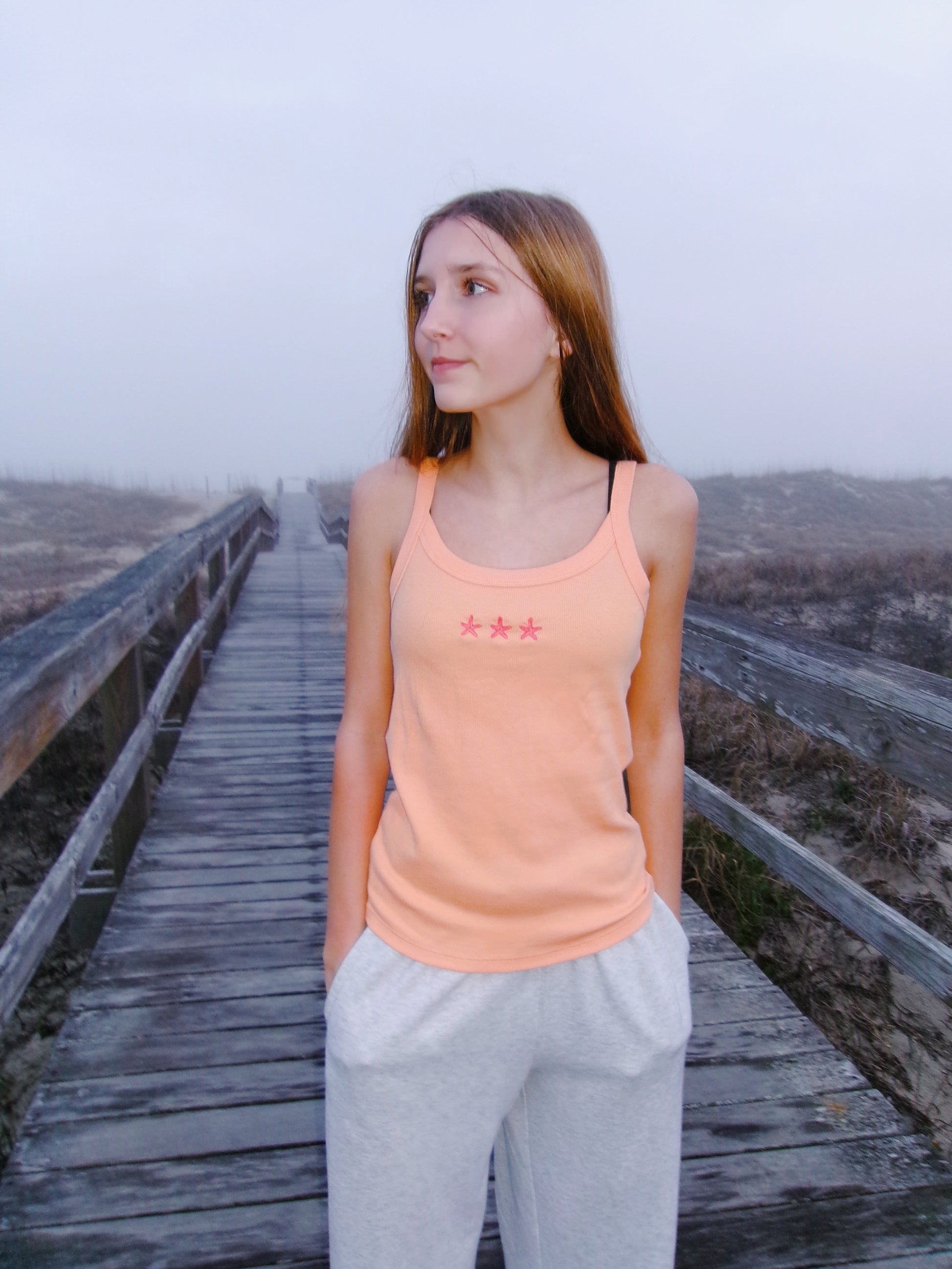 This super pretty orange tank top has three starfish.